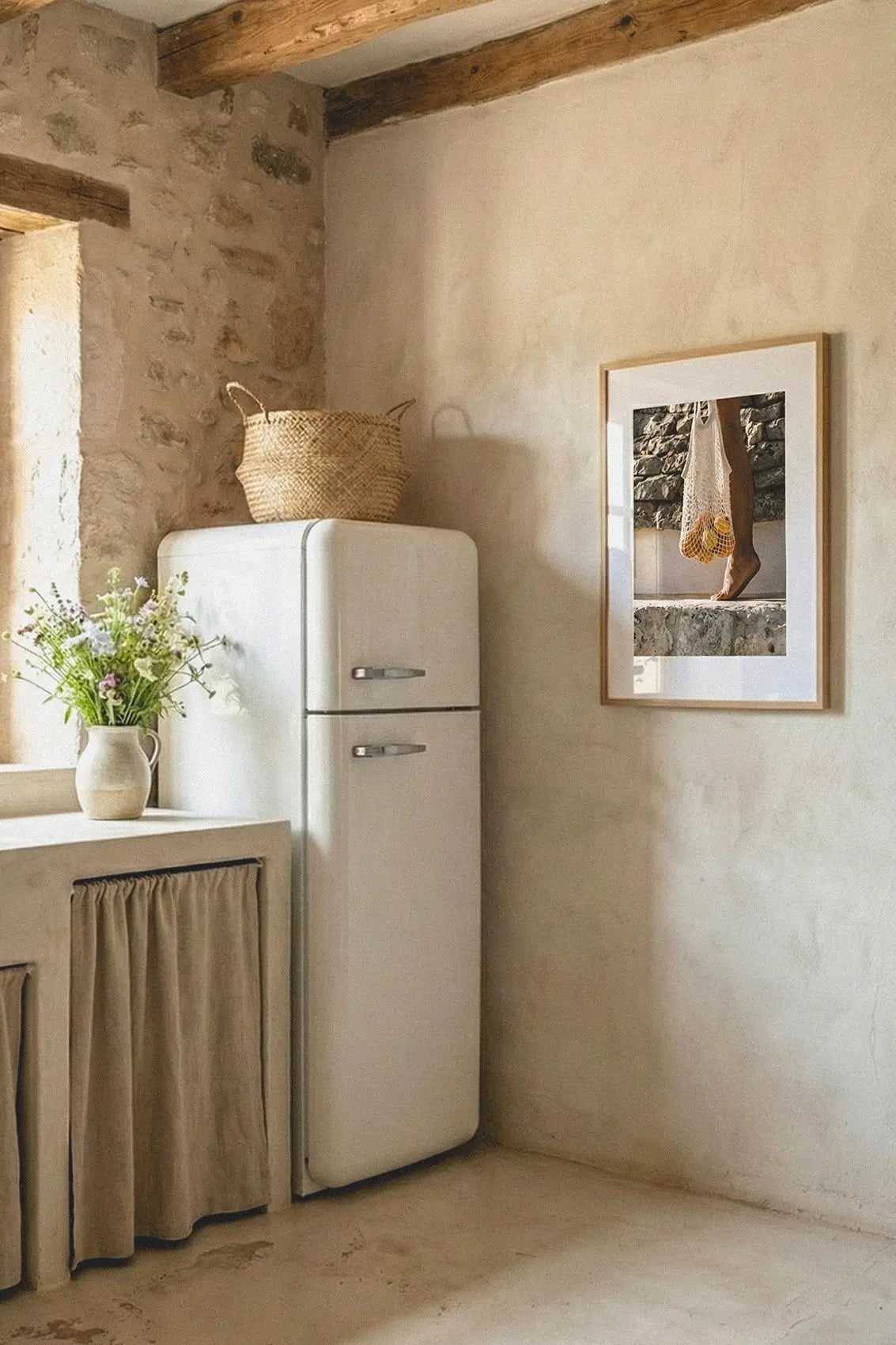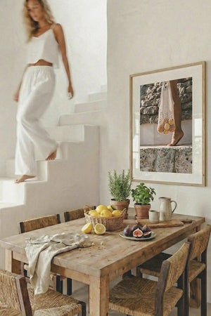 A warm-toned fine art print capturing lemons, natural texture, and a quiet Mediterranean mood in a refined photographic composition. This coastal wall art blends still life photography, sunlit summer tones, and timeless minimalist style for an elegant interior.