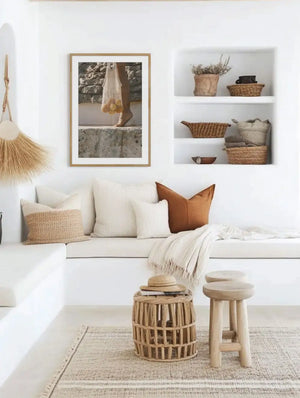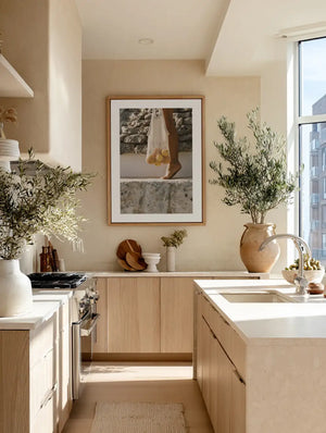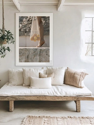 A warm-toned fine art print capturing lemons, natural texture, and a quiet Mediterranean mood in a refined photographic composition. This coastal wall art blends still life photography, sunlit summer tones, and timeless minimalist style for an elegant interior.