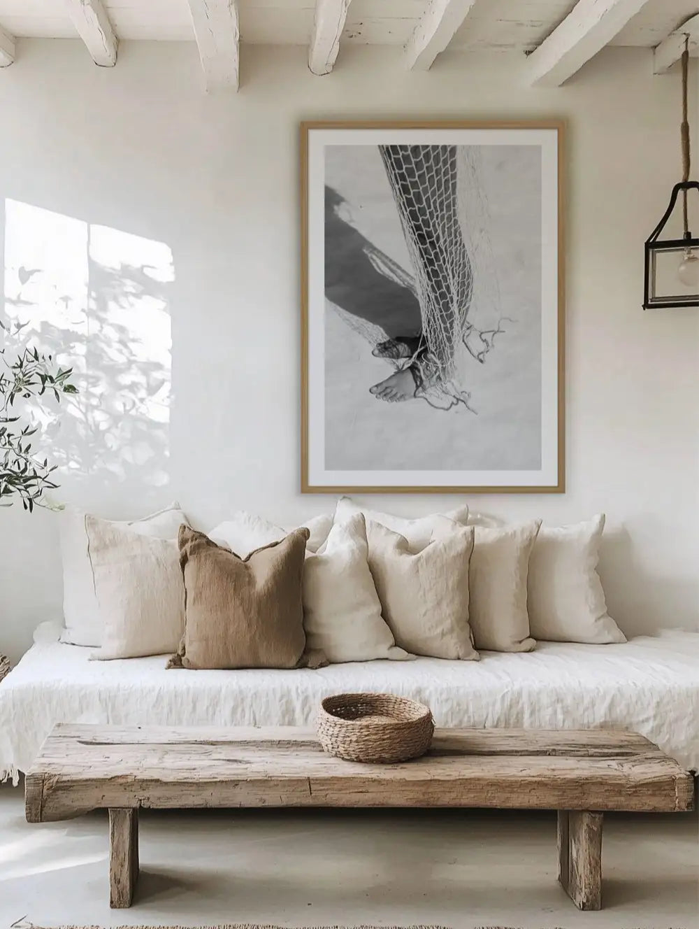 Experience 'Barefoot Bonds,' a striking black and white print capturing the delicate interplay between shadow and light as feet rest gently against a soft mesh, evoking a story of relaxed elegance.