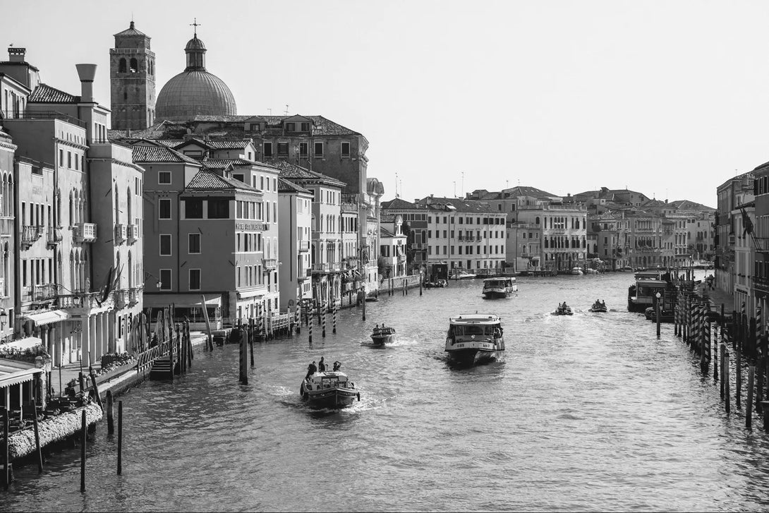 A captivating black-and-white photograph of Venice's iconic Grand Canal, showcasing the timeless beauty of its architecture and the serene flow of gondolas and boats.