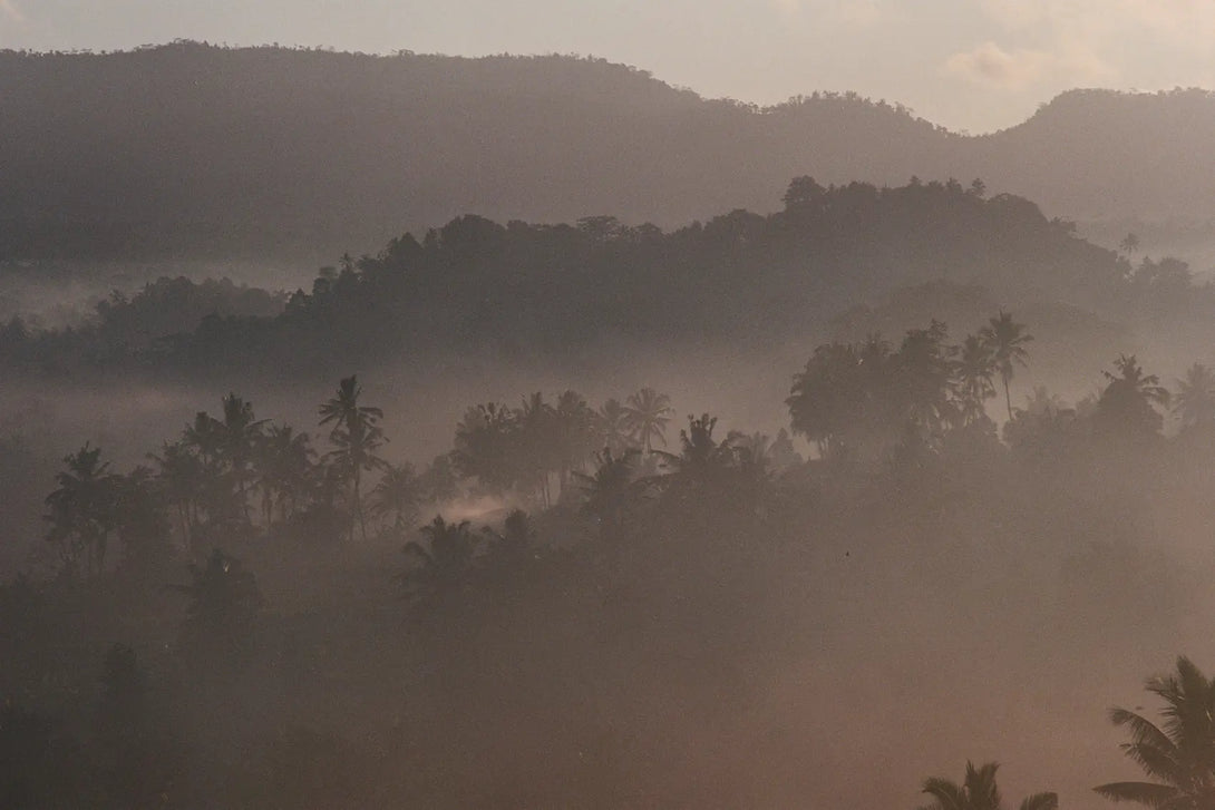 A serene view of Bali's mist-covered hills and palm trees at dawn, capturing the tranquil beauty of the island's natural landscape.