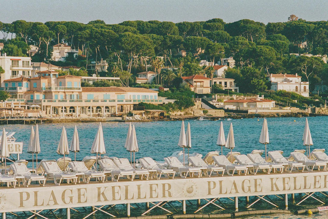 A stunning view of Plage Keller on the French Riviera, where rows of pristine white sunbeds and umbrellas line the crystal-clear Mediterranean waters. The beautiful backdrop of luxury villas and lush greenery adds to the charm of this peaceful coastal scene.