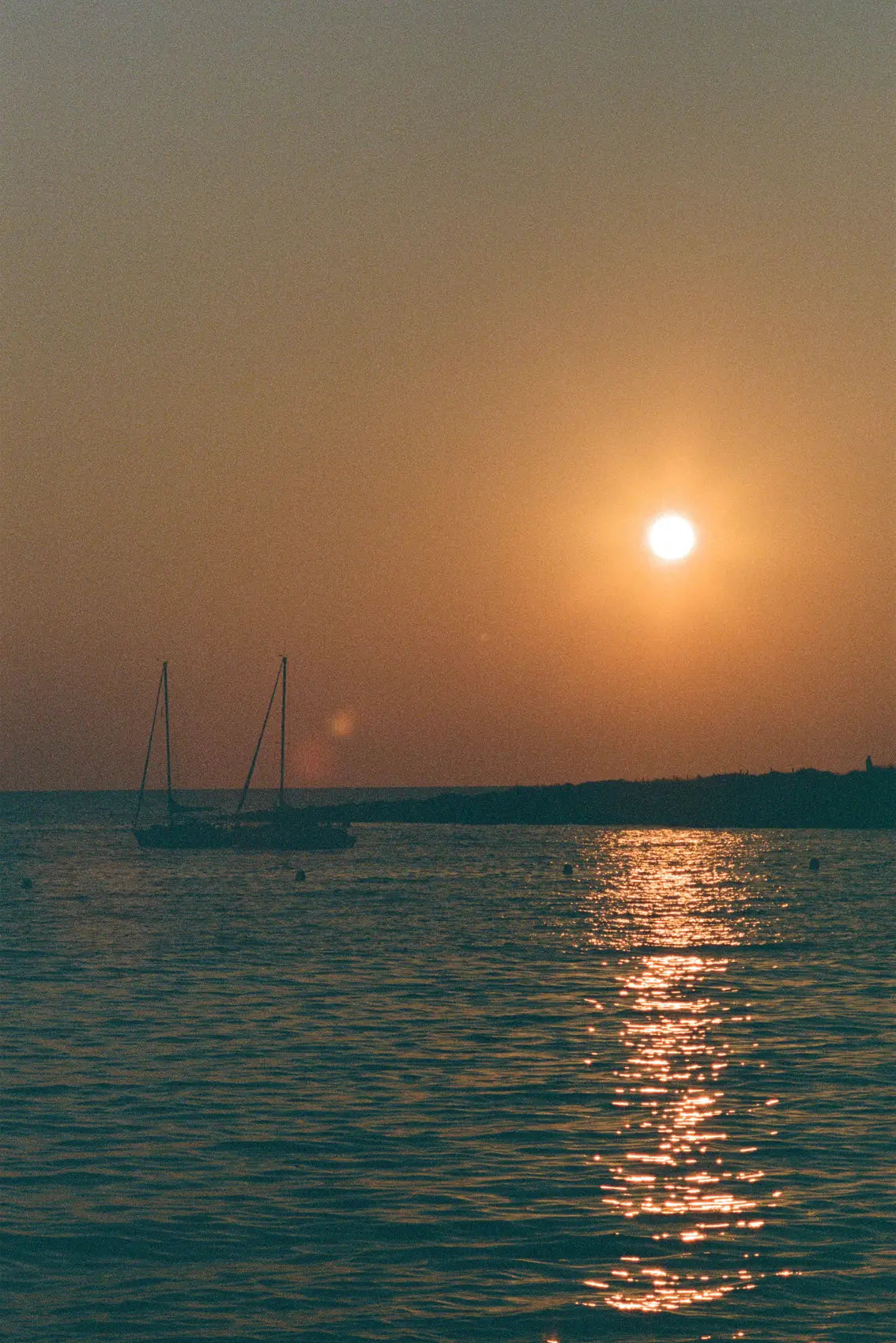 A fine art print capturing a lone sailboat, glowing sunset light, and shimmering sea reflections in a calm coastal composition. This wall art blends Mediterranean photography, warm horizon tones, and timeless evening elegance for a refined interior.