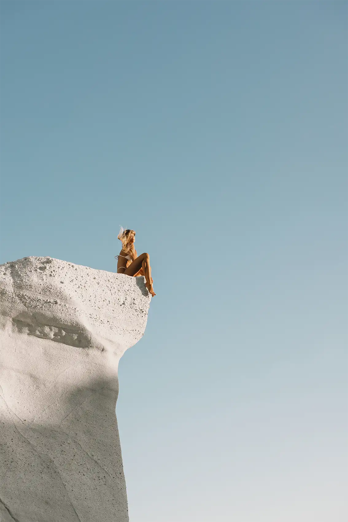 A fine art print capturing a solitary figure on the sculptural cliffs of Milos beneath a clear blue sky. This coastal wall art blends Greek island photography, minimalist composition, and timeless Mediterranean elegance for a refined interior.
