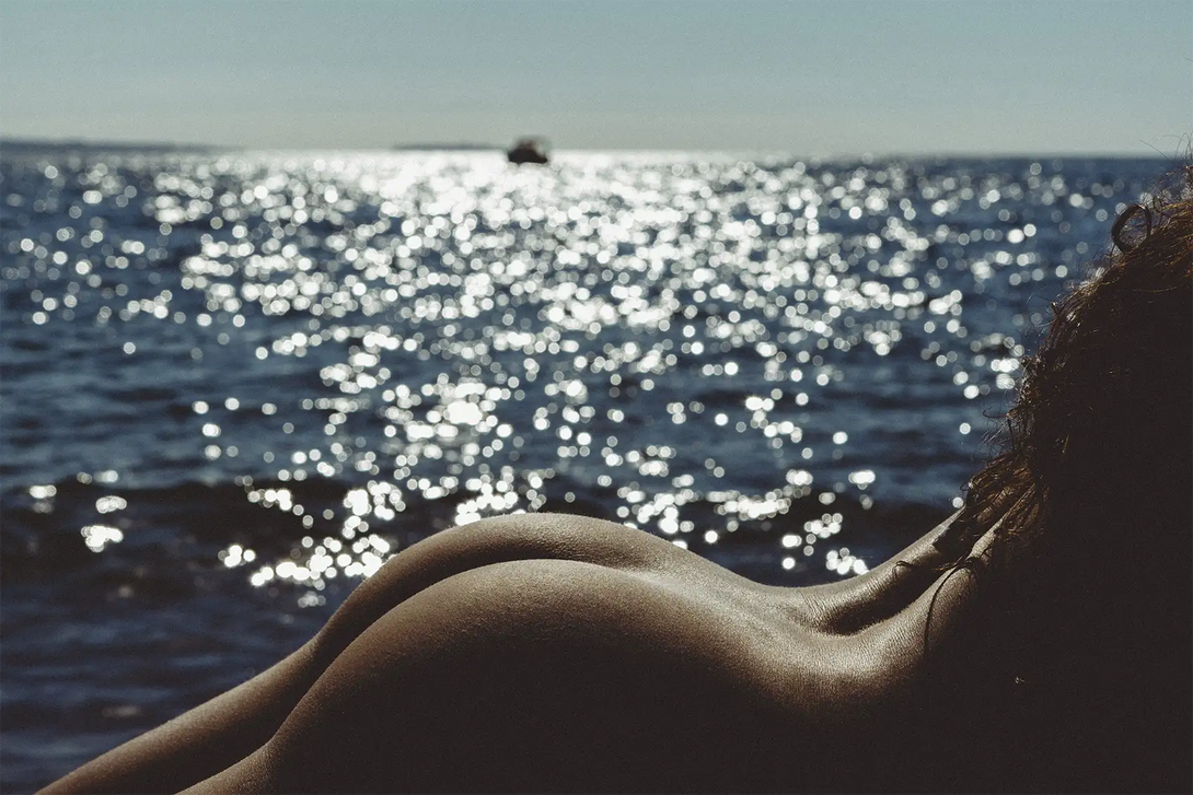 "Solar Silhouette" is a captivating portrayal of a woman's silhouette against the sun, her back gracefully outlined in a dance with the natural light. The ocean and boats in the background add a serene maritime context, creating an image that's both intimate and expansive, a signature motif of Hommage Art's distinct style.