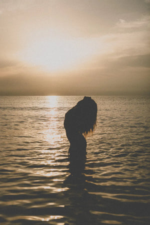 A warm-toned fine art print capturing a silhouetted figure in calm sea water at sunset. This coastal wall art blends cinematic photography, golden light, and timeless Mediterranean mood for a refined modern interior.