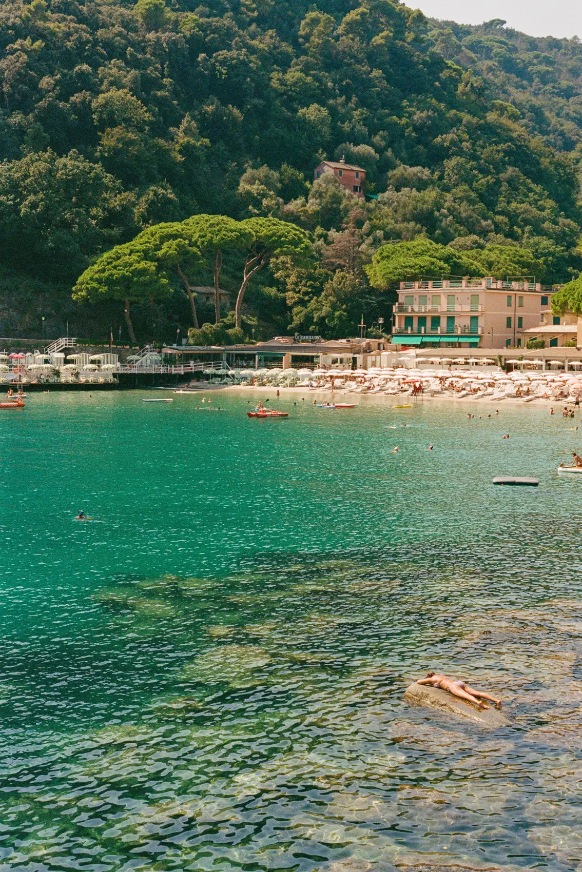 A fine art print capturing a quiet Italian cove with turquoise water, sunlit shore, and lush coastal landscape. This Mediterranean wall art blends travel photography, summer calm, and timeless Riviera elegance for a refined interior.