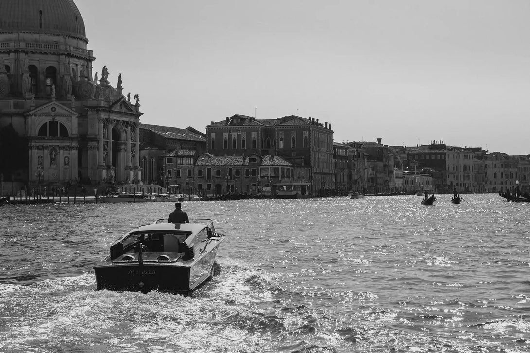 A serene black-and-white depiction of Venice's timeless beauty. A luxury boat glides through the shimmering Grand Canal, framed by historic architecture and gondolas.